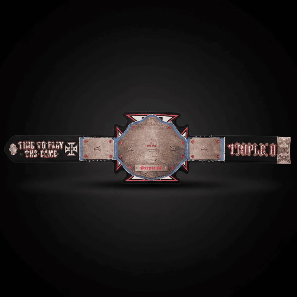 This championship belt features intricately detailed metal plates celebrating Triple H’s 30-year career, including his iconic Evolution era elements and World Heavyweight Championship styling. The bold center plate and ornate side plates create a visually commanding and prestigious appearance, while the durable strap supports display use, cosplay, fan events, and themed photography. Its presentation makes it perfect for shelves, walls, fan caves, offices, and wrestling-themed spaces where a championship belt can dominate attention.