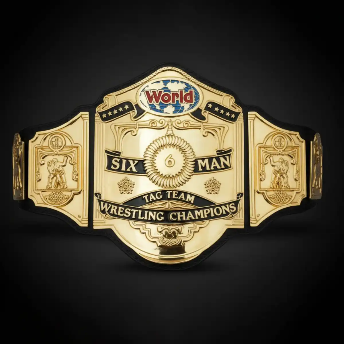 The WCW Six Man World Tag Team Wrestling Championship Belt is a distinctive wrestling collectible inspired by one of World Championship Wrestling’s most unique titles. Designed to represent three-man teams competing at a high level, this championship reflects a different style of wrestling competition focused on teamwork, strategy, and group dominance. It is an excellent choice for fans who appreciate WCW history and collectors looking for a belt that stands apart from traditional single or tag team titles.